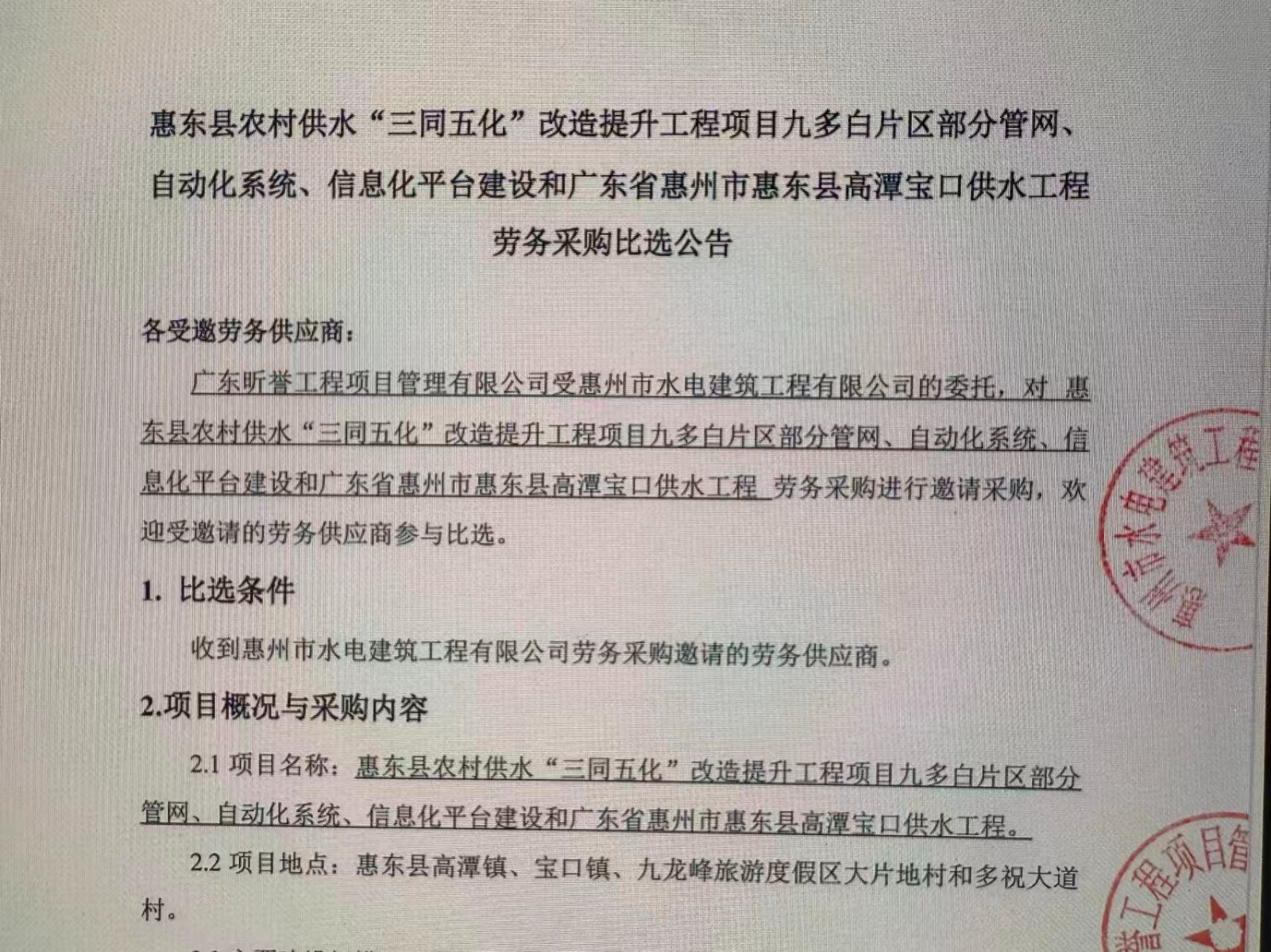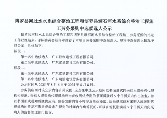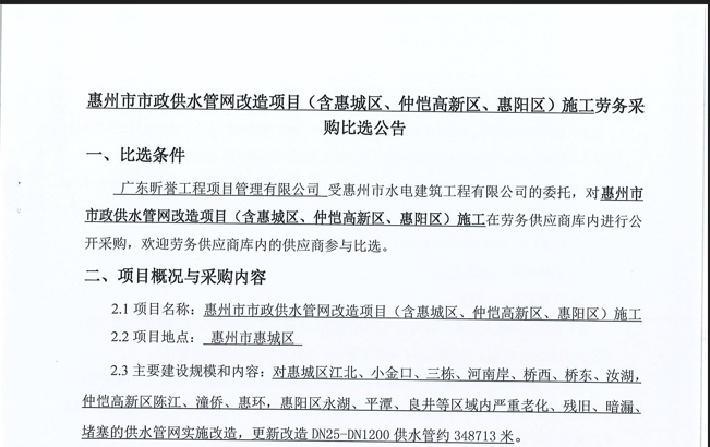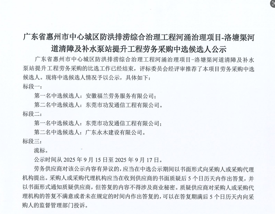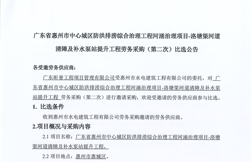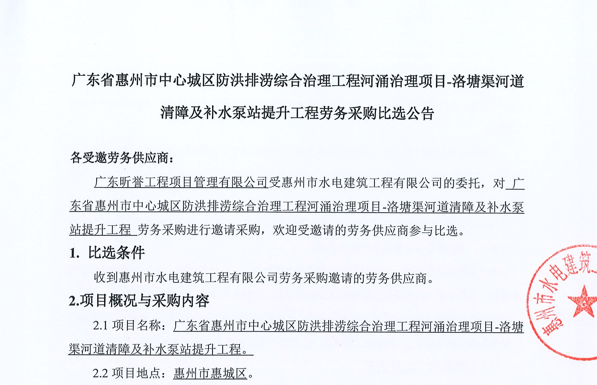 惠州市增江龍門段治理工程施工(一標段)勞務采購比選公告……